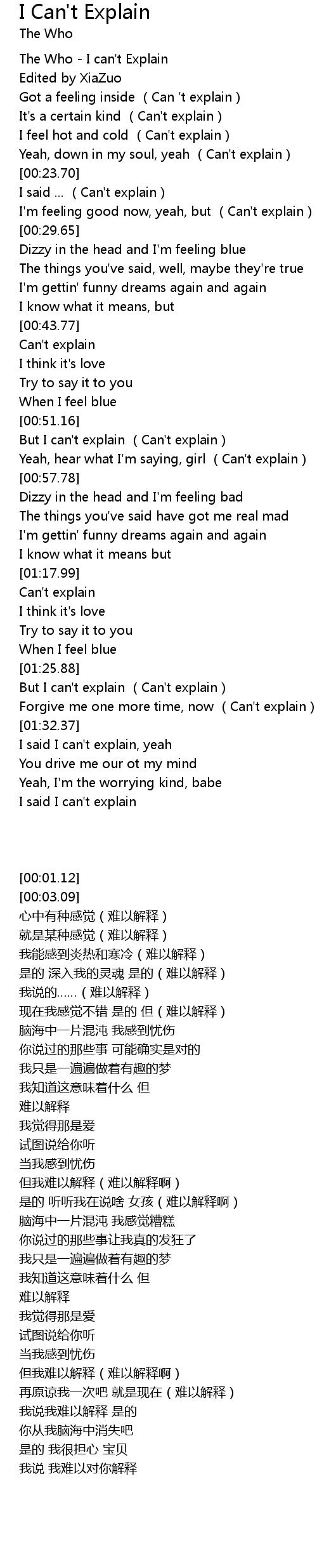 | [00:10.59] | Got a feeling inside Can ' t explain |
