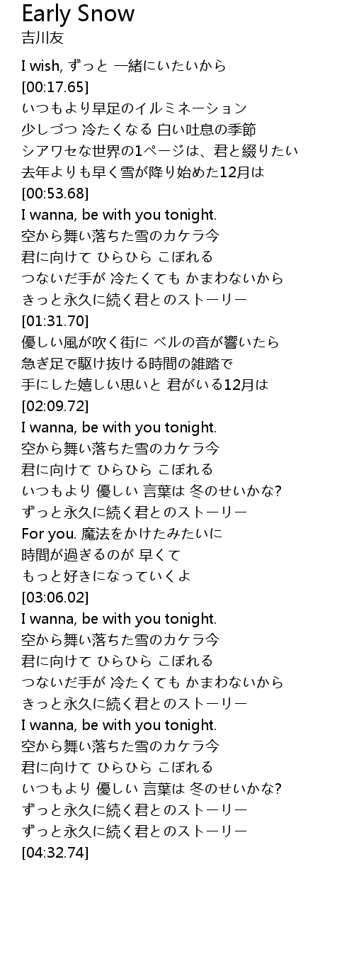 | [00:57.62] | 空から舞い落ちた雪のカケラ今 |