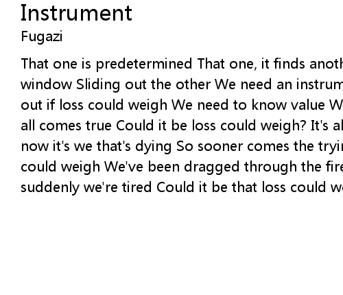 That one is predetermined That one, it finds another This one comes in one window Sliding out the other We need an instrument to take a measurement To find out if loss could weigh We need to know value We need to place value In case it all comes true Could it be loss could weigh? It's always they that's dying But now it's we that's dying So sooner comes the trying to understand that loss could weigh We've been dragged through the fire We bragged about that fire But suddenly we're tired Could it be that loss could weigh? Loss could weigh