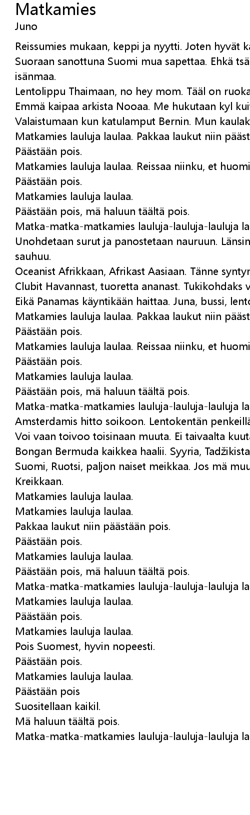| Matka-matka-matkamies lauluja-lauluja-lauluja laulaa. |
