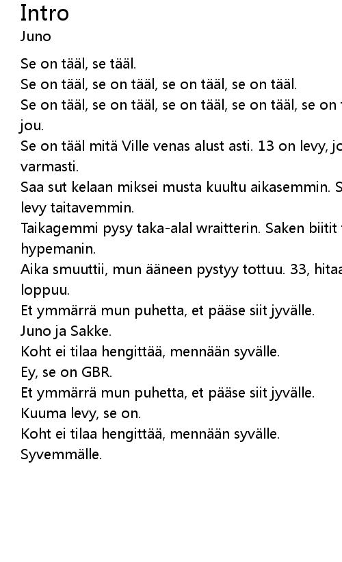 | Aika smuuttii, mun ääneen pystyy tottuu. 33, hitaal, repeat pääl ei voi loppuu. | |