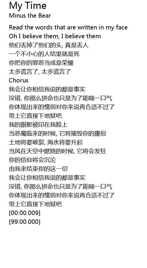 | [01:22.34] | wǒ huì ràng nǐ xiāng xìn wǒ shuō de dōu shì shì shí |
