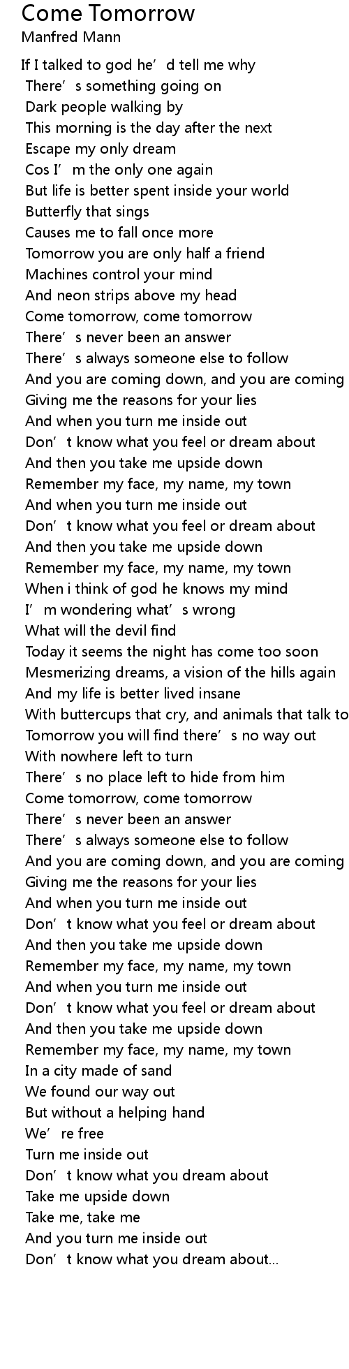 | Come tomorrow, come tomorrow | |