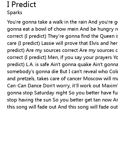 You're gonna take a walk in the rain And you're gonna get wet (I predict) You're gonna eat a bowl of chow mein And be hungry real soon (I predict) Are my sources correct (I predict) They're gonna find the Queen is a man But that Philip don't care (I predict) Lassie will prove that Elvis and her Had a fleeting affair (I predict) Are my sources correct Are my sources correct Yes I know they're correct (I predict) Men, if you say your prayers You'll never lose your hair (I predict) L.A. is safe Ain't gonna quake Ain't gonna quake (I predict) And somebody's gonna die But I can't reveal who Cold beer will cure a cold Cold beer and pretzels, takes care of cancer Moscow will march to France They'll do the Can-Can Dance Don't worry, it'll work out Maxim's will throw them out They're gonna stop Saturday night So you better have fun now (I predict) They're gonna stop having the sun So you better get tan now And this song will fade out And this song will fade out And this song will fade out (I predict) |