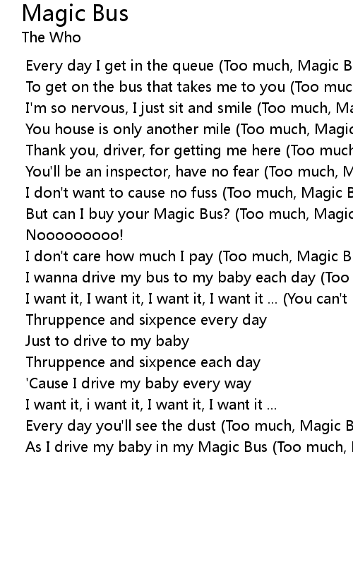 I wanna drive my bus to my baby each day (Too much, Magic Bus) |