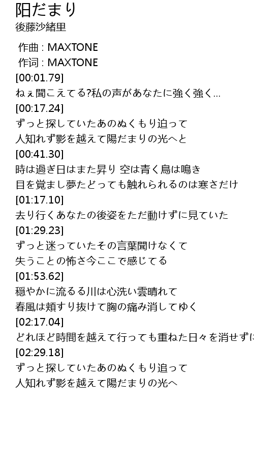 | [00:29.18] | 人知れず影を越えて陽だまりの光へと |