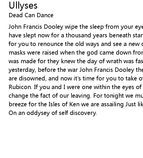 John Francis Dooley wipe the sleep from your eyes and embrace the light. You have slept now for a thousand years beneath starless nights. And now its time for you to renounce the old ways and see a new dawn rise. In former days the masks were raised when the god came down from off the mountain, and a sacrifice was made for they knew the day of wrath was fast apporaching. Just like yesterday, before the war John Francis Dooley the scapegoat has run all our sins are disowned, and now it's time for you to take off thy mask and cross the Rubicon. If you and I were one within the eyes of our designs it would still not change the fact of our leaving. For tonight we must leave with the first gentle breeze for the Isles of Ken we are assailing Just like Ullyses, on an open sea. On an oddysey of self discovery. |