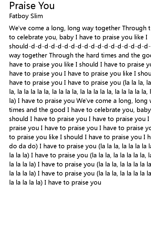 We've come a long, long way together Through the hard times and the good I have to celebrate you, baby I have to praise you like I should-d-d-d-d-d-d-d-d-d-d-d-d-d-d-d-d-d-d-d-d-d-d-d... We've come a long, long way together Through the hard times and the good I have to celebrate you, baby I have to praise you like I should I have to praise you I have to praise you I have to praise you I have to praise you like I should I have to praise you I have to praise you I have to praise you (la la la, la la la la la, la la la la la, la la la la la, la la la la, la la la la la, la la la la la, la la la la la la) I have to praise you We've come a long, long way together Through the hard times and the good I have to celebrate you, baby I have to praise you like I should I have to praise you I have to praise you I have to praise you I have to praise you I have to praise you I have to praise you I have to praise you I have to praise you like I should I have to praise you I have to praise you (do da do, do da do) I have to praise you (la la la, la la la la la, la la la la la, la la la la la) I have to praise you (la la la, la la la la la, la la la la la, la la la la la la) I have to praise you (la la la, la la la la la, la la la la la, la la la la la) I have to praise you (la la la, la la la la la, la la la la la, la la la la la la) I have to praise you |