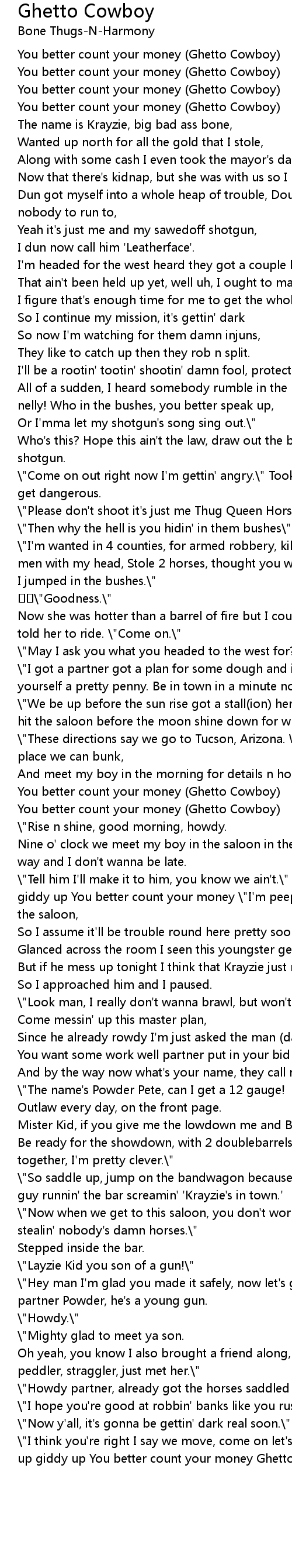 | " Tell him I' ll make it to him, you know we ain' t." Move out! Giddy up giddy up giddy up You better count your money " I' m peepin' Krayzie' s ' Wanted' poster in the saloon, | |