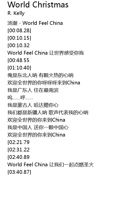 | [03:19.37][02:40.89] | World Feel China 让世界牵手龙的传人 |