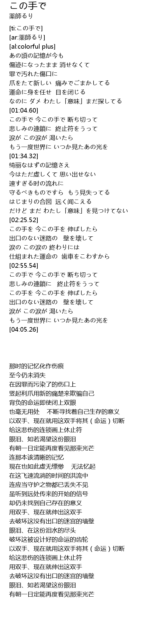 | [01:05.10] | 以双手、现在就用这双手将其(命运)切断 |