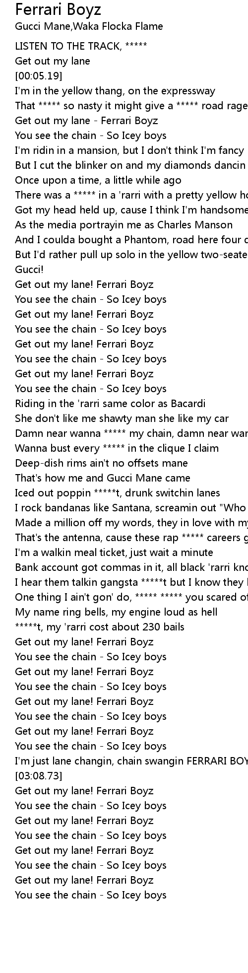 [03:01.15] I'm just lane changin, chain swangin FERRARI BOYZ