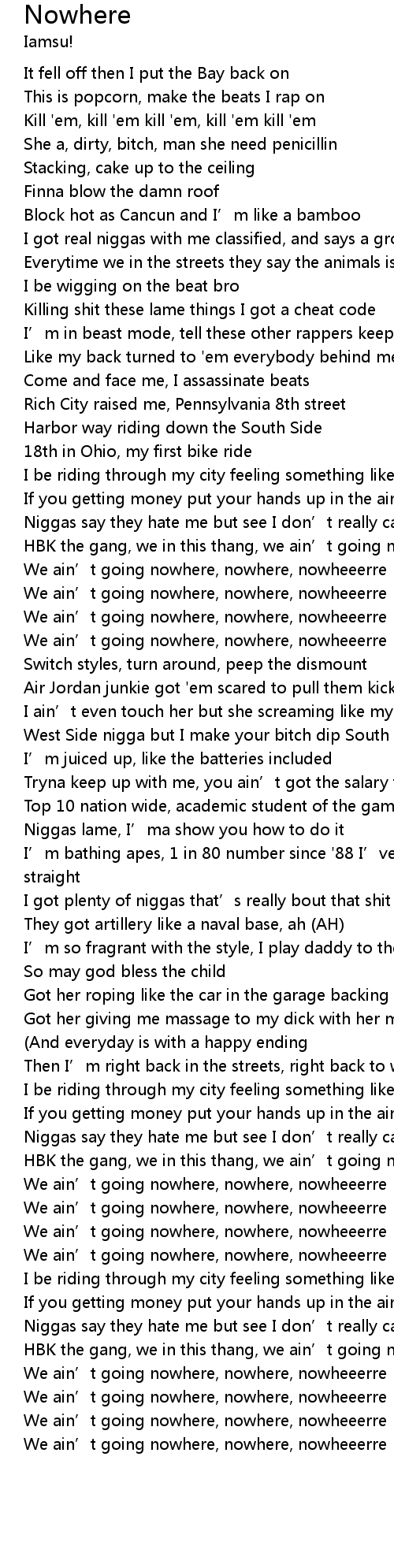 | [01:29.15] | We ain' t going nowhere, nowhere, nowheeerre |