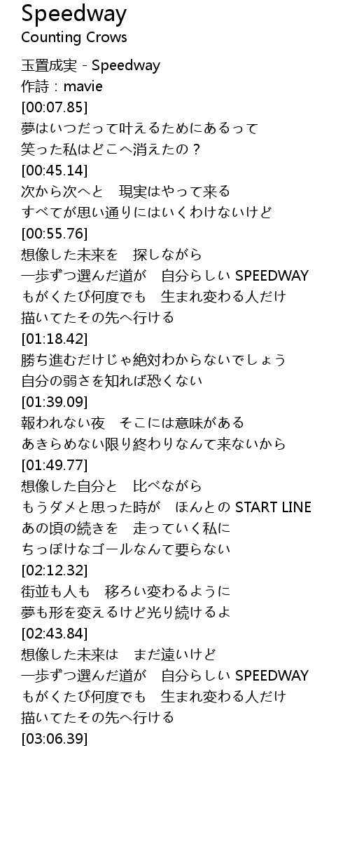 | [02:49.57] | 一歩ずつ選んだ道が 自分らしい SPEEDWAY |