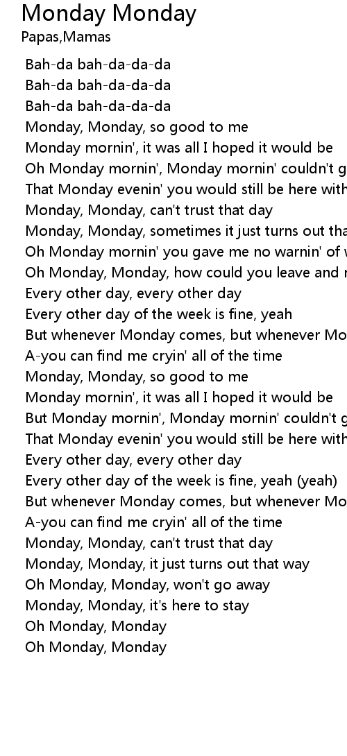 | [00:47.528] | Monday, Monday, can't trust that day |