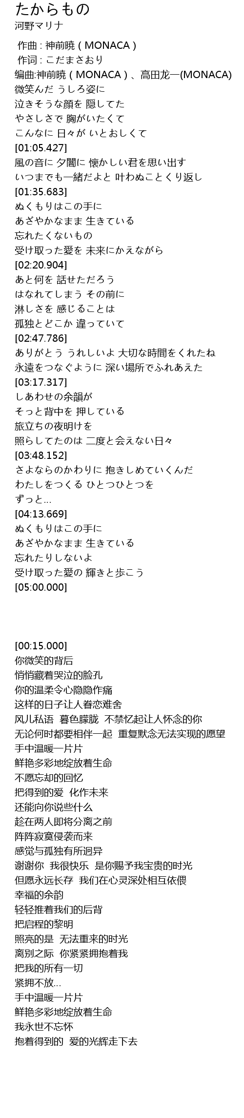 | [03:59.702] | わたしをつくる ひとつひとつを |