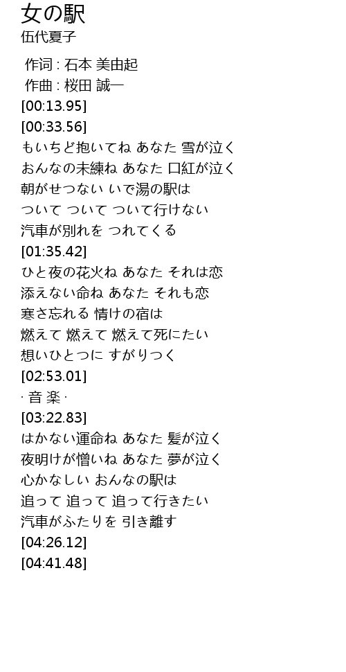 | [01:01.29] | 朝がせつない いで湯の駅は |