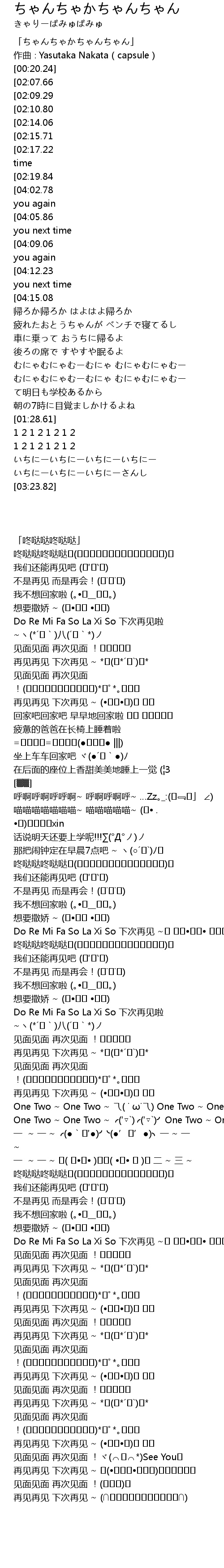| [03:34.11][02:17.22][01:38.92][00:34.88] | ドレミファソラシソ see you next time |