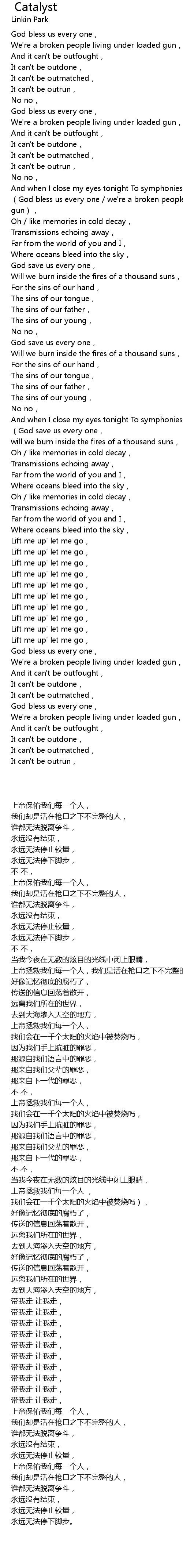 | [01:15.74] | (God bless us every one / we're a broken people living under loaded gun), |