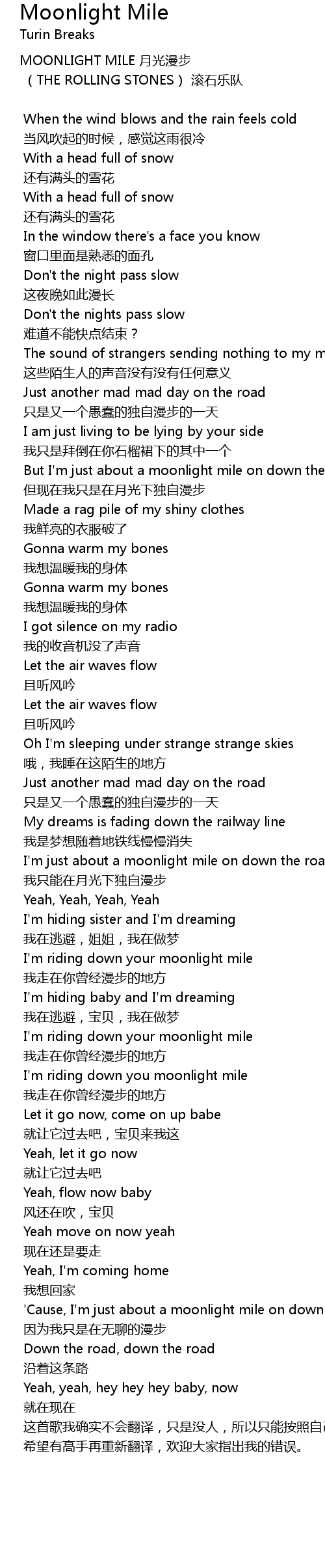 | ' Cause, I' m just about a moonlight mile on down the road | |