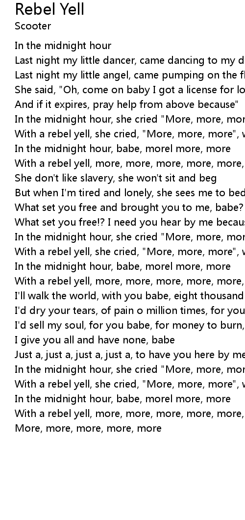 In the midnight hour, she cried "More, more, more" |