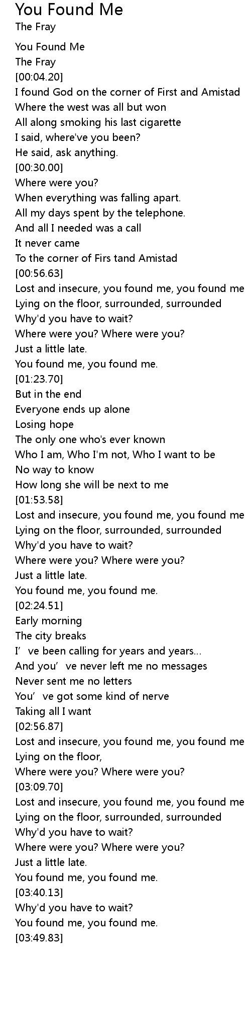 | [03:10.19] | Lost and insecure, you found me, you found me |
