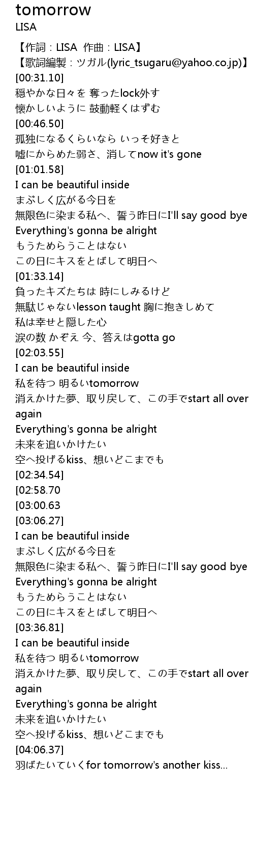| [00:11.60] | 【作詞:LISA 作曲:LISA】 |