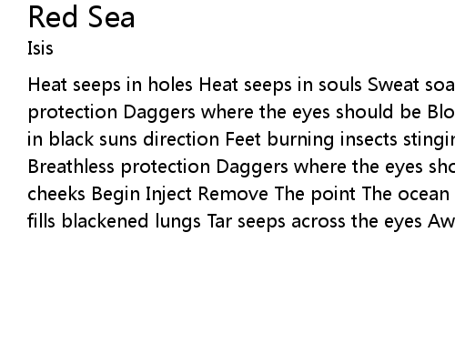 | Heat seeps in holes Heat seeps in souls Sweat soaked yellow shroud Breathless protection Daggers where the eyes should be Blood running down your cheeks Eyes in black suns direction Feet burning insects stinging Sweat soaked yellow shroud Breathless protection Daggers where the eyes should be Blood running down your cheeks Begin Inject Remove The point The ocean spreads beneath the skin Fluid fills blackened lungs Tar seeps across the eyes Away in the sea of red |