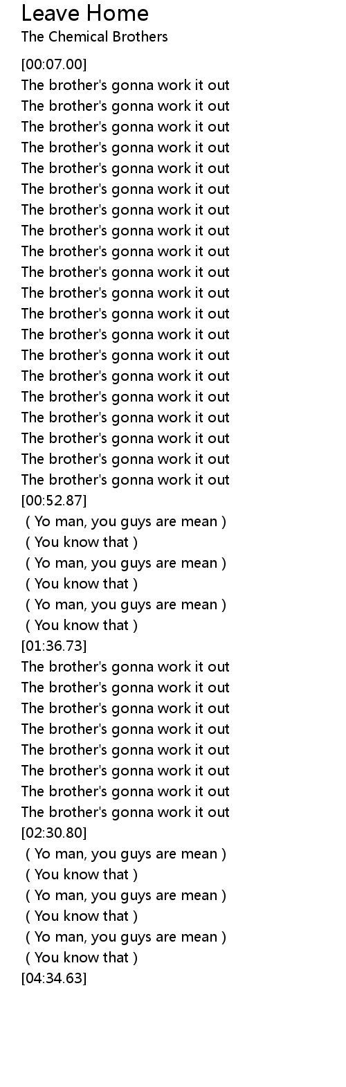 | [00:43.81] | The brother' s gonna work it out |