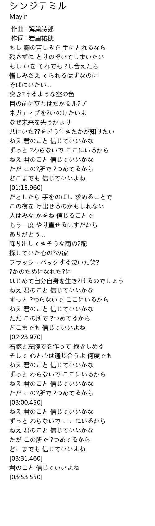 | [03:11.330] | ねえ 君のこと 信じていいかな |
