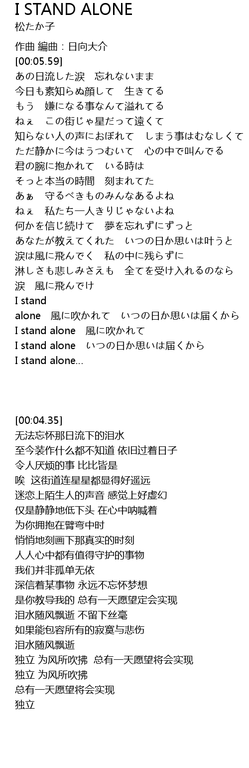 | [03:34.74] | I stand alone いつの日か思いは届くから |