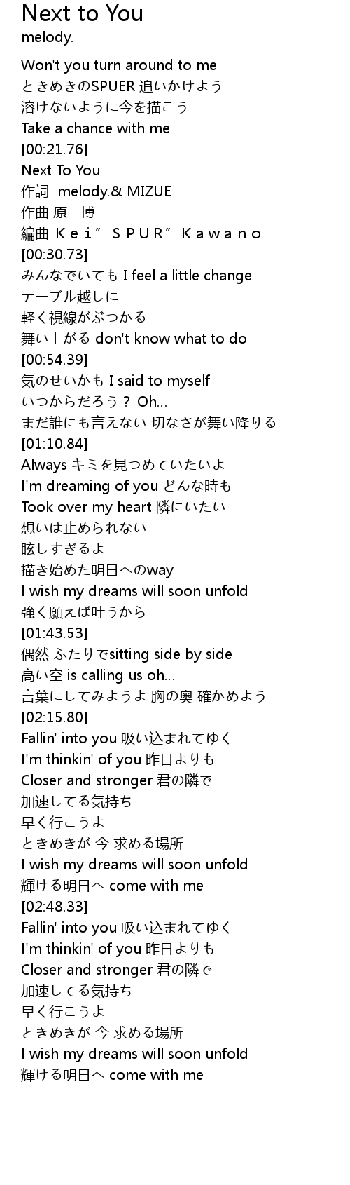 | [02:24.34] | Closer and stronger 君の隣で |