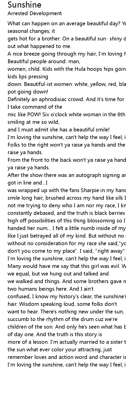 I'm loving the sunshine, can't help the way I feel, in the sunshine. |
