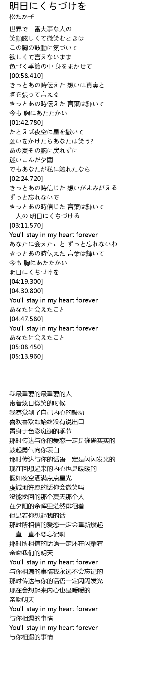 | [04:55.730] | You' ll stay in my heart forever |