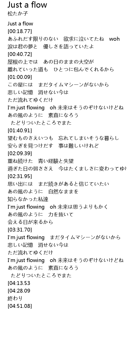 | [03:32.04] | I'm just flowing まだタイムマシーンがないから |
