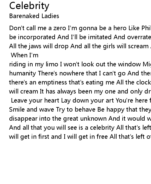 Don't call me a zero I'm gonna be a hero Like Phil Esposito or the Kennedys I'll be incorporated And I'll be imitated And overrated, but that doesn't bother me All the jaws will drop And all the girls will scream And there will be commotion when I show up on the scene All that you will see is a celebrity [x2] When I'm riding in my limo I won't look out the window Might make me homesick for humanity There's nowhere that I can't go And there's nobody I don't know And there's an emptiness that's eating me All the clocks will stop And all the jeans will cream It has always been my one and only dream All that's left of me is my celebrity [x2] Leave your heart Lay down your art You're here for the party Smile and wave Try to behave Be happy that they've made you a celebrity I could disappear into the great unknown And it would wear my face as if it were its own And all that you will see is a celebrity All that's left of me is my celebrity I will get in first and I will get in free All that's left of me is my celebrity |