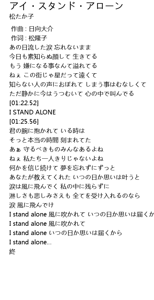 | [03:12.68] | I stand alone 風に吹かれて いつの日か思いは届くから |