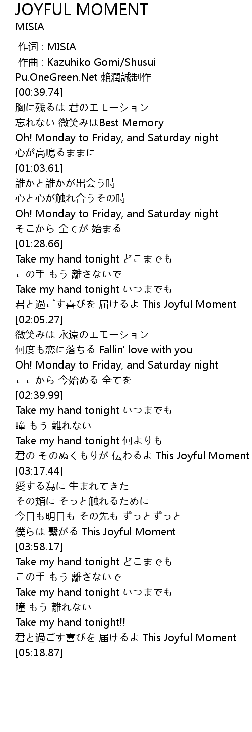 | [05:04.87] | 君と過ごす喜びを 届けるよ This Joyful Moment |