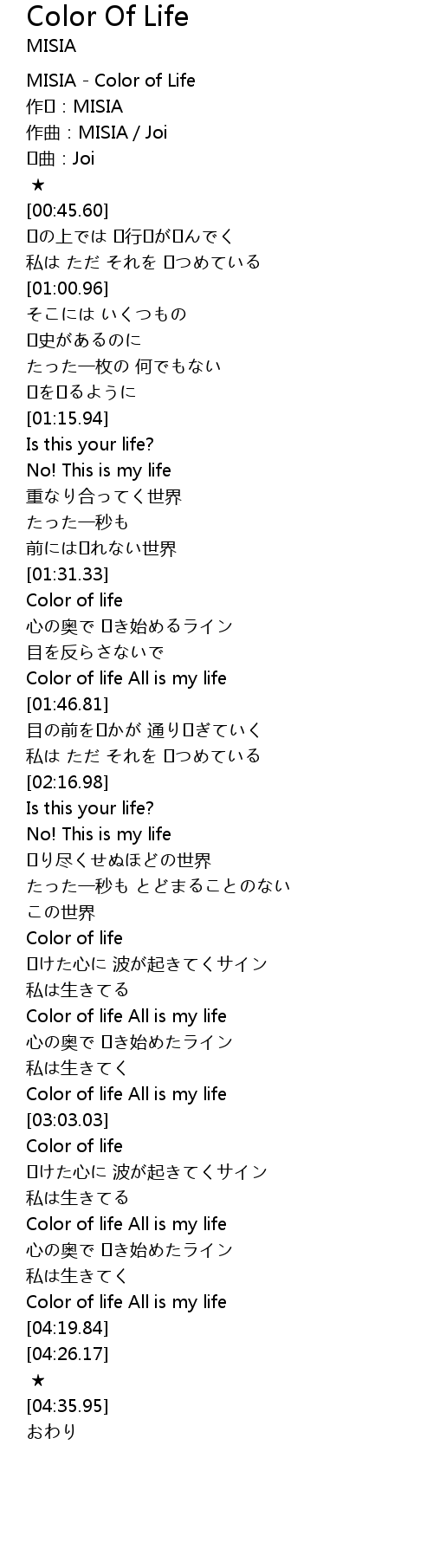 | [00:00.00] | MISIA - Color of Life |