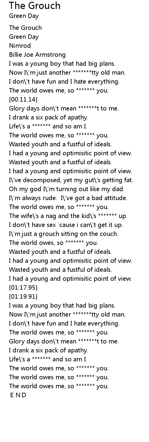 | [00:53.76] | I\'m just a grouch sitting on the couch. |