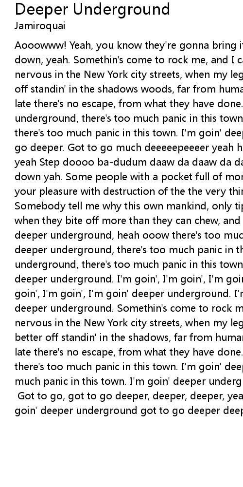 Aooowww! Yeah, you know they're gonna bring it down now. They're gonna wreck it down, yeah. Somethin's come to rock me, and I can't keep my head. I've get nervous in the New York city streets, when my legacy treads. I know I'm better off standin' in the shadows woods, far from humans with guns. But now it's too late there's no escape, from what they have done. Come on! I'm goin' deeper underground, there's too much panic in this town. I'm goin' deeper underground, there's too much panic in this town. I'm goin' deeper underground. Well I got to go deeper. Got to go much deeeeepeeeer yeah ha. Heh they're gonna wreck it down yeah Step doooo ba-dudum daaw da daaw da da-daaw heah, yeh we gotta bring it down yah. Some people with a pocket full of money, and an eye full of hate. Take your pleasure with destruction of the the very thing, that they try to create. Somebody tell me why this own mankind, only tip of them touch. Heaven help them when they bite off more than they can chew, and now it's too much. I'm goin' deeper underground, heah ooow there's too much panic in this town. I'm goin' deeper underground, there's too much panic in this town. I'm goin' deeper underground, there's too much panic in this town I'm goin', I'm goin', I'm goin' deeper underground. I'm goin', I'm goin', I'm goin' deeper underground. I'm goin', I'm goin', I'm goin' deeper underground. I'm goin', I'm goin', I'm goin' deeper underground. Somethin's come to rock me, and I can't keep my head. I get nervous in the New York city streets, when my legacy treads. I know I'm still better off standin' in the shadows, far from humans with guns. But now it's too late there's no escape, from what they have done. I'm goin' deeper underground, there's too much panic in this town. I'm goin' deeper underground, there's too much panic in this town. I'm goin' deeper underground, there's too much panic in this town. [background] Got to go, got to go deeper, deeper, deeper, yeah. I'm goin' deeper underground got to go deeper deeperr gotta get down now |