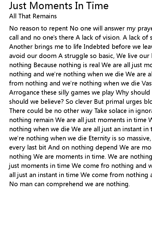 No reason to repent No one will answer my prayers And in the black of night I call and no one's there A lack of vision. A lack of sight One god destroys me, Another brings me to life Indebted before we leave the womb A lifetime spent to avoid our doom A struggle so basic, We live our lives in fear It still means nothing Because nothing is real We are all just moments in time We come from nothing and we're nothing when we die We are all just an instant in time We come from nothing and we're nothing when we die Vastness confounds us every day Arrogance these silly games we play Why should we believe we are eternal? Why should we believe? So clever But primal urges block our way Designed by time, There could be no other way Take solace in ignorance, Return to nothing And in nothing remain We are all just moments in time We come from nothing and we're nothing when we die We are all just an instant in time We come from nothing and we're nothing when we die Eternity is so massive, We cannot comprehend So take every last bit And on nothing depend We are moments in time. We come from nothing We are moments in time. We are nothing No man can comprehend We are all just moments in time We come fro nothing and we're nothing when we die We are all just an instant in time We come from nothing and we're nothing when we die No man can comprehend we are nothing. |