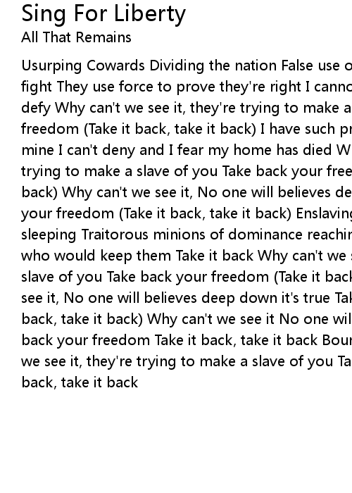 Usurping Cowards Dividing the nation False use of power Total damnation Unending fight They use force to prove they're right I cannot hide I know that we must defy Why can't we see it, they're trying to make a slave of you Take back your freedom (Take it back, take it back) I have such pride in the land I thought was mine I can't deny and I fear my home has died Why can't we see it, they're trying to make a slave of you Take back your freedom (Take it back, take it back) Why can't we see it, No one will believes deep down it's true Take back your freedom (Take it back, take it back) Enslaving and binding while countrymen sleeping Traitorous minions of dominance reaching Cast out the fallen and all who would keep them Take it back Why can't we see it, they're trying to make a slave of you Take back your freedom (Take it back, take it back) Why can't we see it, No one will believes deep down it's true Take back your freedom (Take it back, take it back) Why can't we see it No one will list it down it's true Take back your freedom Take it back, take it back Bound with lies Terrified Why can't we see it, they're trying to make a slave of you Take back your freedom Take it back, take it back |