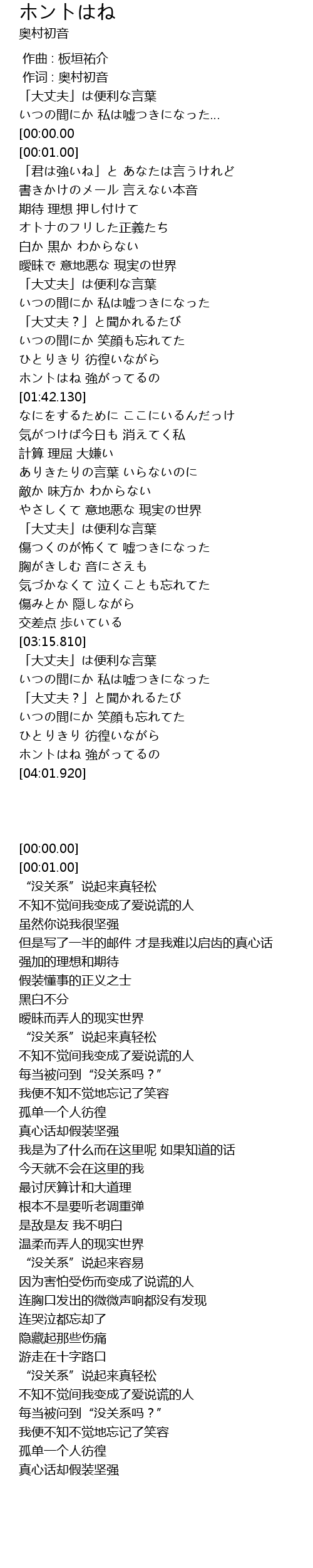| [01:16.680] | いつの間にか 私は嘘つきになった |