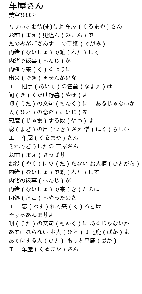 | [00:14.71] | ちょいとお待(ま)ちよ 车屋(くるまや)さん |