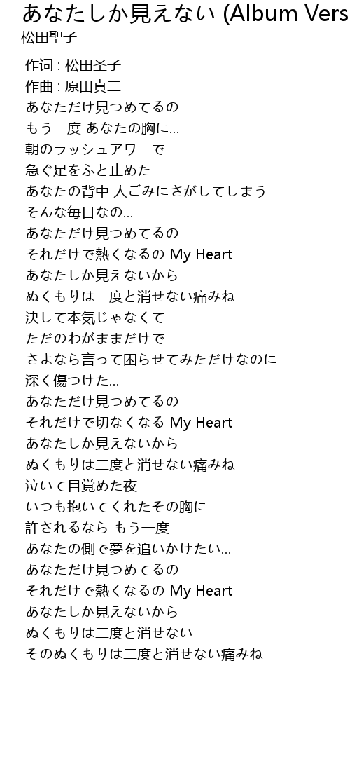 | [02:35.359] | あなただけ見つめてるの |