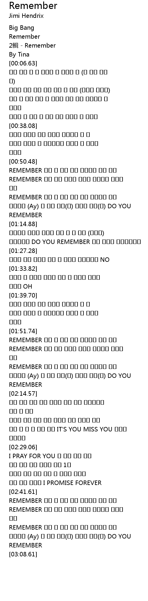 | [02:41.77] | REMEMBER 너와 한 모든 약속 행복하게 만들 거야 |