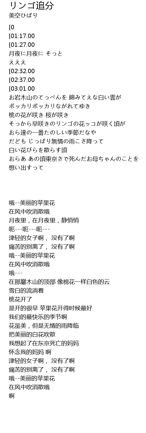 | [00:18.00][01:17.00][02:41.50] | リンゴの花びらが |