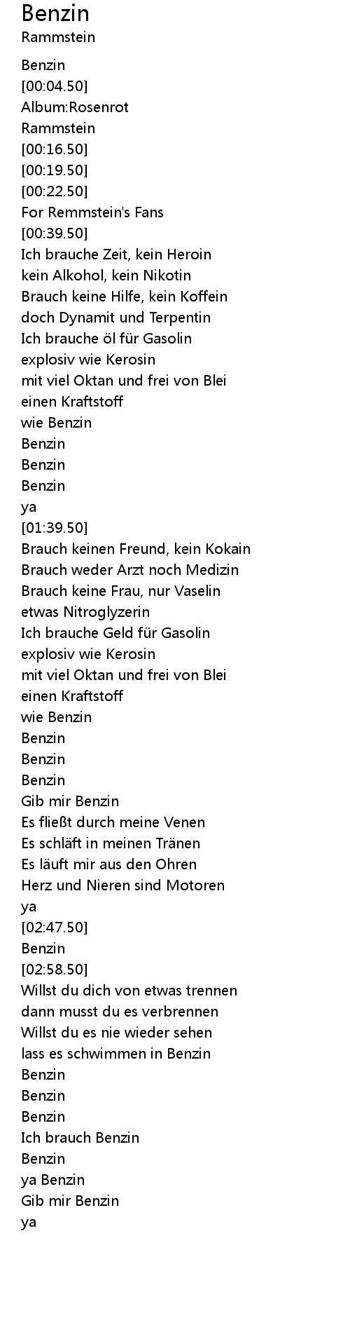 | [01:07.00] | Ich brauche l fü r Gasolin |