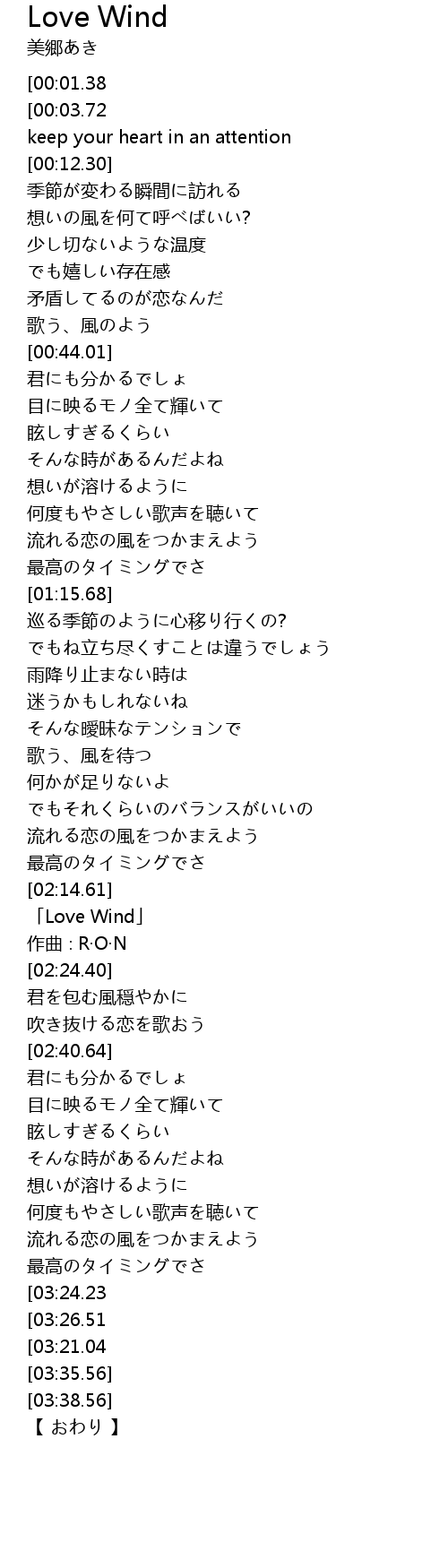 | [03:02.91] | 流れる恋の風をつかまえよう |